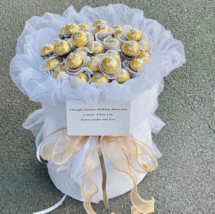 商品簡介:材料33顆費列羅巧克力,帶珠白色網紗裝飾包裝白色軟網紗+白色硬紙圓形包裝,香檳色蕾絲帶+香檳色細緞帶+白色細緞帶束扎