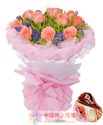 材料包裝: 粉玫瑰11枝 滿天星;外加德芙巧克力109克