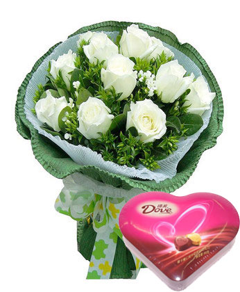 材料包裝: 9支白玫瑰 加巴西葉情人草搭配;外加德芙巧克力98克