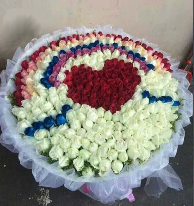 材料包裝: 紅、白,粉,香檳,紫,藍玫瑰共999朵,滿天星、綠葉圍繞,白色紙內包白色紗外包,紅色蝴蝶結裝飾