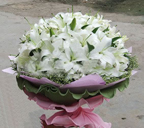 商品簡介:白色百合99朵,(為保持新鮮,部分花朵呈未開放狀態)綠葉搭配; 包裝:淺紫色鄒紋紙內襯,青綠色粉紅卷邊紙組合圓形包裝