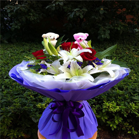 商品簡介:白色多頭百合3支,3朵紅色玫瑰加兩只熊公仔,黃鶯、勿忘我間插;商品包裝:百合網紗內襯,淡紫色皺邊紙高檔包裝
