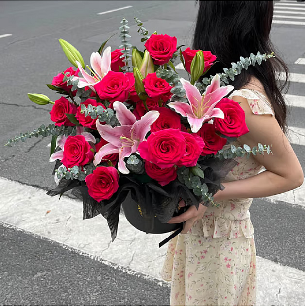 材料包裝: 33支紅玫瑰+2支多頭百合(不少于6朵),綠葉點綴,圍色包裝圍邊,黑色抱抱桶。