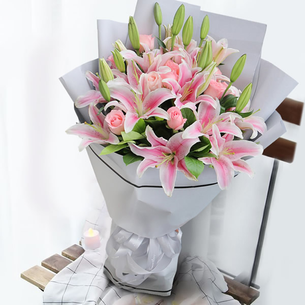 商品簡介:多頭粉色百合7支,11朵粉玫瑰;灰色高檔包裝,絲帶結扎