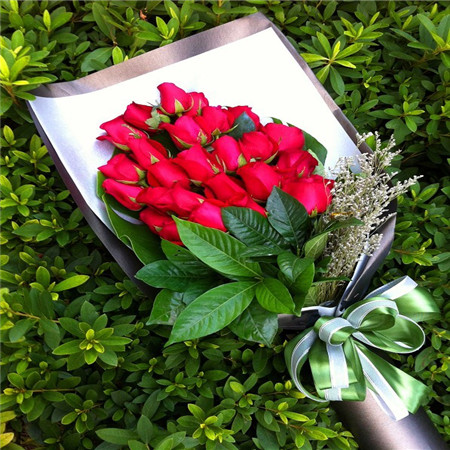 商品簡介:紅玫瑰22枝 綠葉搭配 商品包裝:高檔深灰色紙扇形包裝