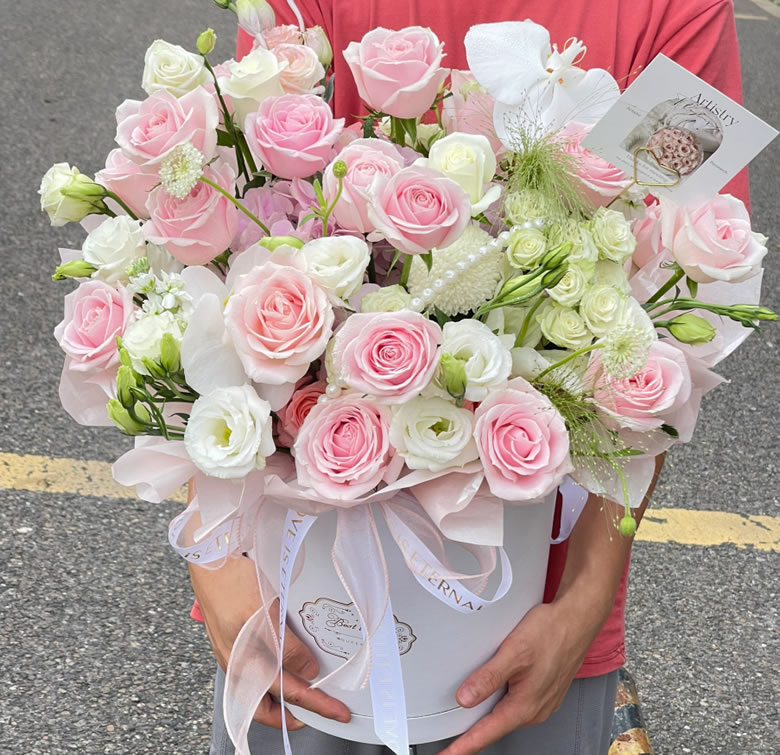 材料包裝: 19枝粉雪山玫瑰,20朵白桔梗,粉繡球一只,白色蝴蝶蘭2朵,綠草間插,抱抱桶。
