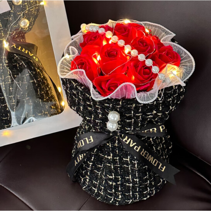 商品簡(jiǎn)介:11紅玫瑰,仿真珍珠一條,燈帶一條,小香風(fēng)包裝。