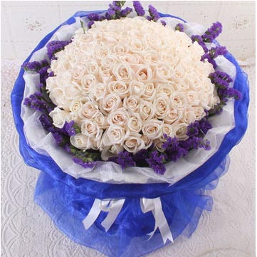 商品簡介:99朵白玫瑰 勿忘我圍繞 紗網包裝