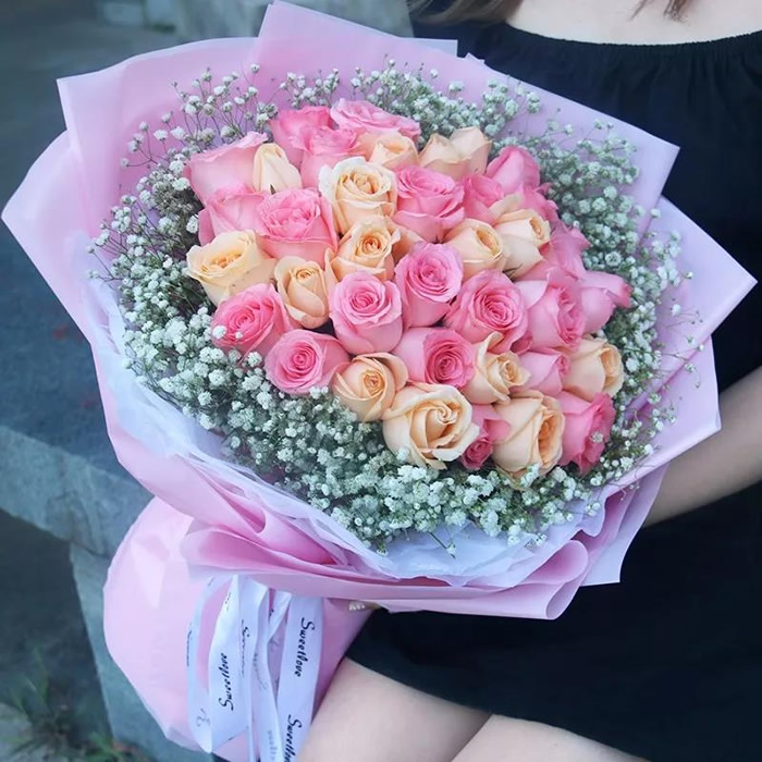 材料包裝: 33朵香檳玫瑰,33朵黛安娜玫瑰,滿天星圍邊,粉色高檔包裝。