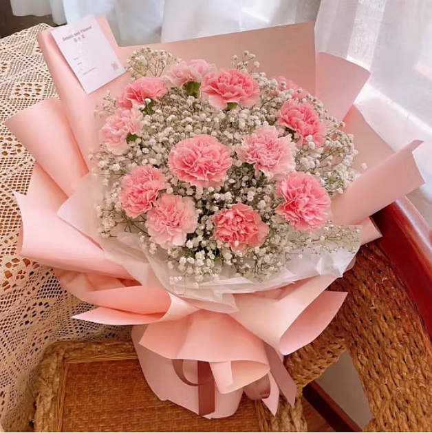 材料包裝: 花材:12支粉色康乃馨,滿天星搭配;包裝:粉色皺紋紙包裝,絲帶結扎