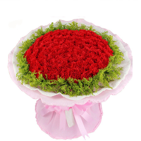 商品簡介:花材:99朵紅色康乃馨,黃鶯外圍;包裝:粉色皺紋紙包裝,絲帶結扎
