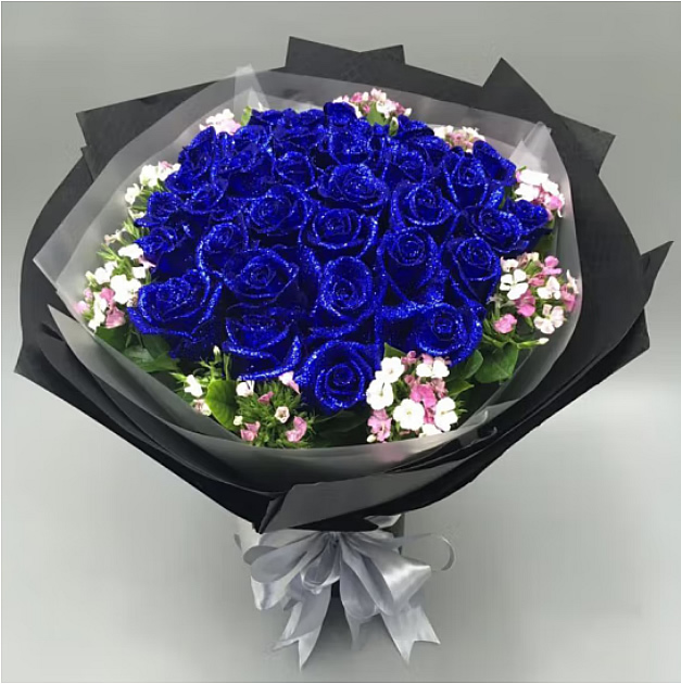 材料包裝: 花材:19朵藍色妖姬,小花間插,包裝:里面透色紙包裝,外面黑色霧面紙包裝