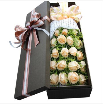 材料包裝: 19枝香檳玫瑰 綠草搭配 白色紗網(wǎng)扎尾 咖啡色禮盒包裝