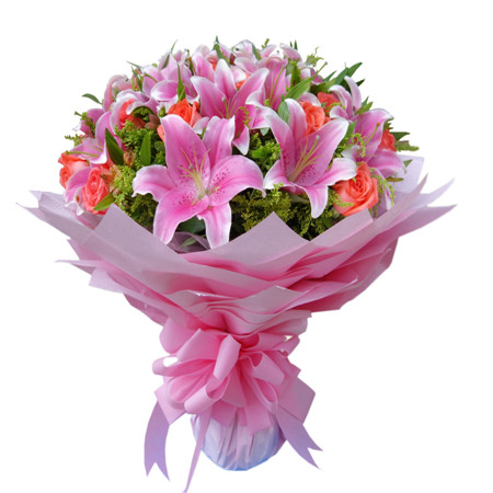 商品簡介:13支粉玫瑰 13朵粉百合 黃鶯點綴 粉色包裝紙包裝