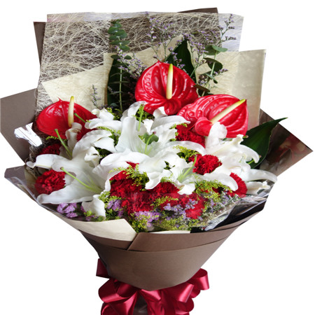 商品簡介:2支白百合 3支紅掌 9支紅康乃馨 黃鶯勿忘我點綴 棕色紙包裝