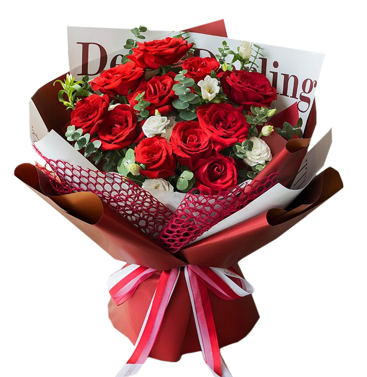 材料包裝: 11支紅玫瑰 2支卡通小熊 黃鶯搭配 白色卷邊紙包裝