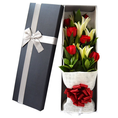 材料包裝: 6朵紅玫瑰,2支多頭百合,精美禮盒