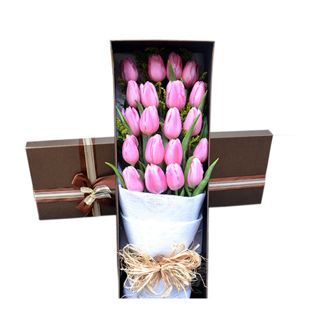 商品簡(jiǎn)介:21支粉色郁金香 黃英搭配 禮盒包裝