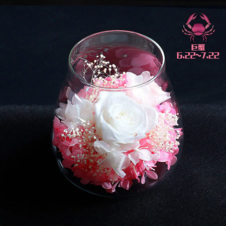 商品簡(jiǎn)介:保鮮花:巨蟹座,白色花;主材:1朵5-6CM進(jìn)口玫瑰;配材:繡球,滿天星;尺寸:12*12CM