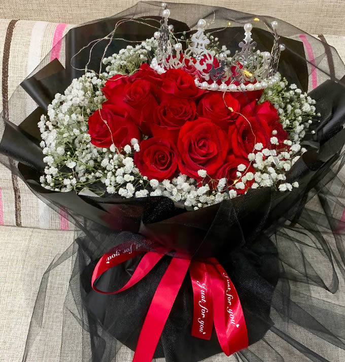 商品簡介:19朵紅玫瑰,漫天星圍邊,皇冠,黑色包裝.燈帶一條,花結.