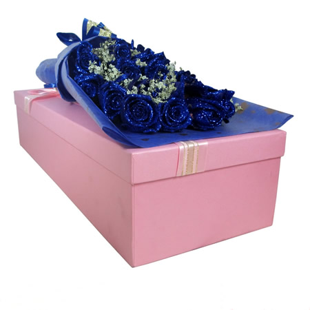 材料包裝: 11枝藍(lán)玫瑰,綠草搭配,禮盒裝