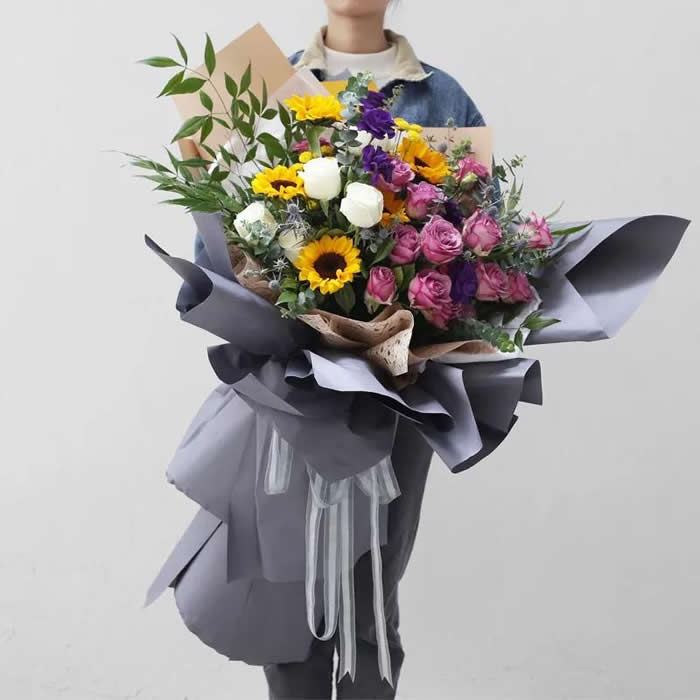 商品簡介:6只白玫瑰,12只紫玫瑰,4只向日葵,4只紫桔梗,小菊若干,綠葉點綴,高檔包裝。