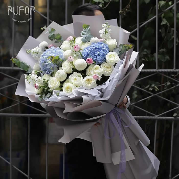 材料包裝: 19朵白玫瑰,8只白色兵乓菊,2只紫色繡球,綠葉配草間插,淡灰色包裝。