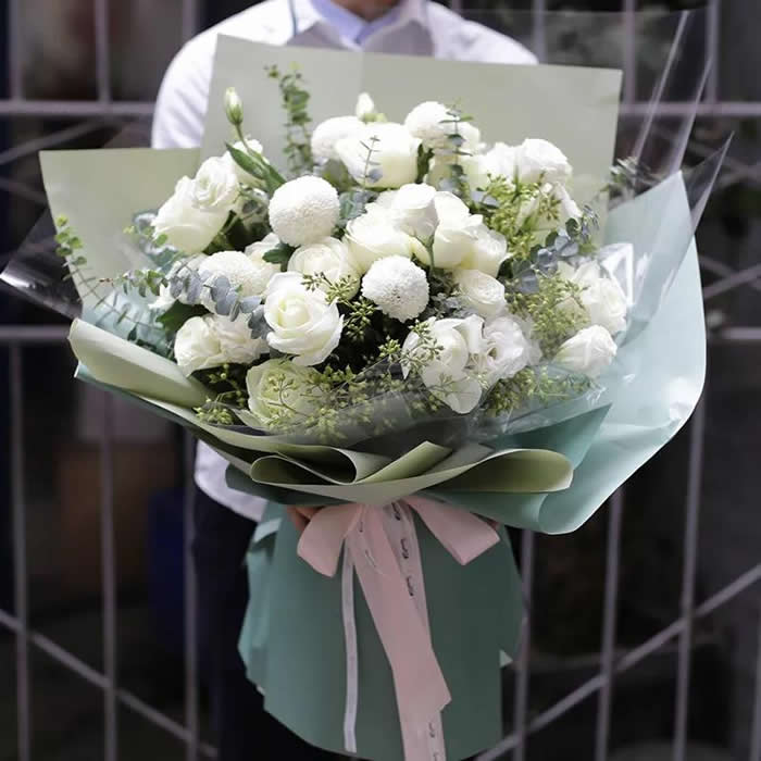 商品簡介:19朵白玫瑰,6只白色兵乓菊,綠葉配草間插,淡綠色包裝。