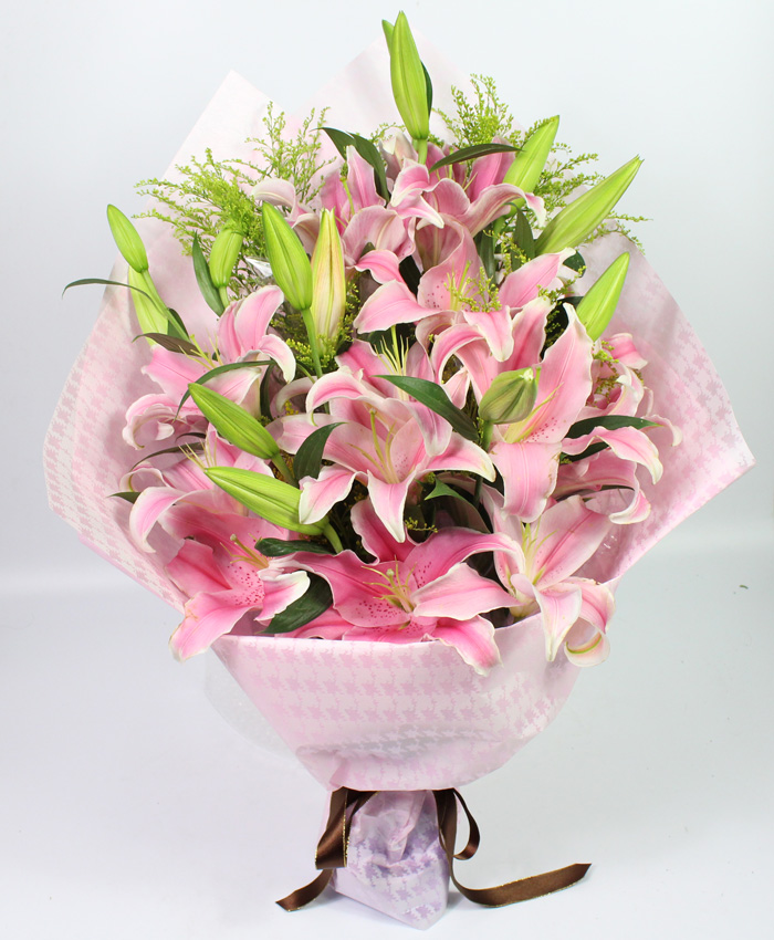 商品簡介:花材:9支多頭粉色百合,搭配黃鶯;包裝:淡粉色包裝紙扇形包裝,絲帶扎尾