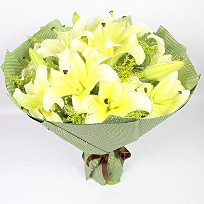 商品簡介:花材:4支多頭黃百合,搭配黃鶯,包裝:綠色包裝紙圓形包裝,絲帶扎尾