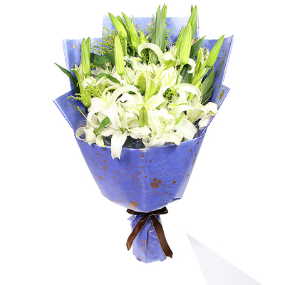 材料包裝: 花材:6支多頭白百合,搭配黃鶯,包裝:藍(lán)色包裝紙扇形包裝,絲帶結(jié)扎