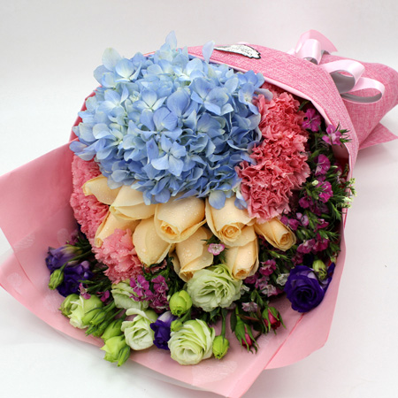 商品簡介:9支香檳玫瑰 9支粉色康乃馨 一支藍(lán)繡球 配草搭配 粉色包裝紙扇形包裝