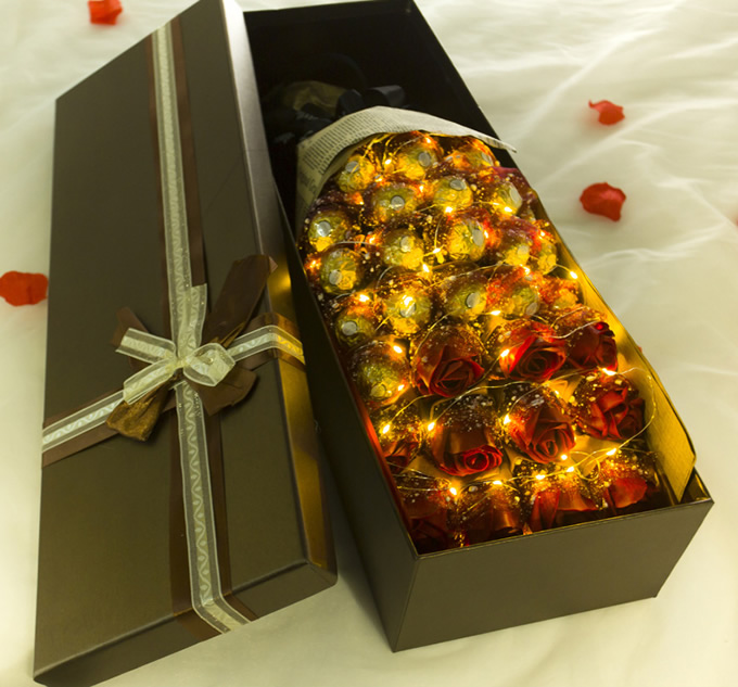 材料包裝: 11朵紅玫瑰,19顆費列羅巧克力,燈帶,禮盒包裝。