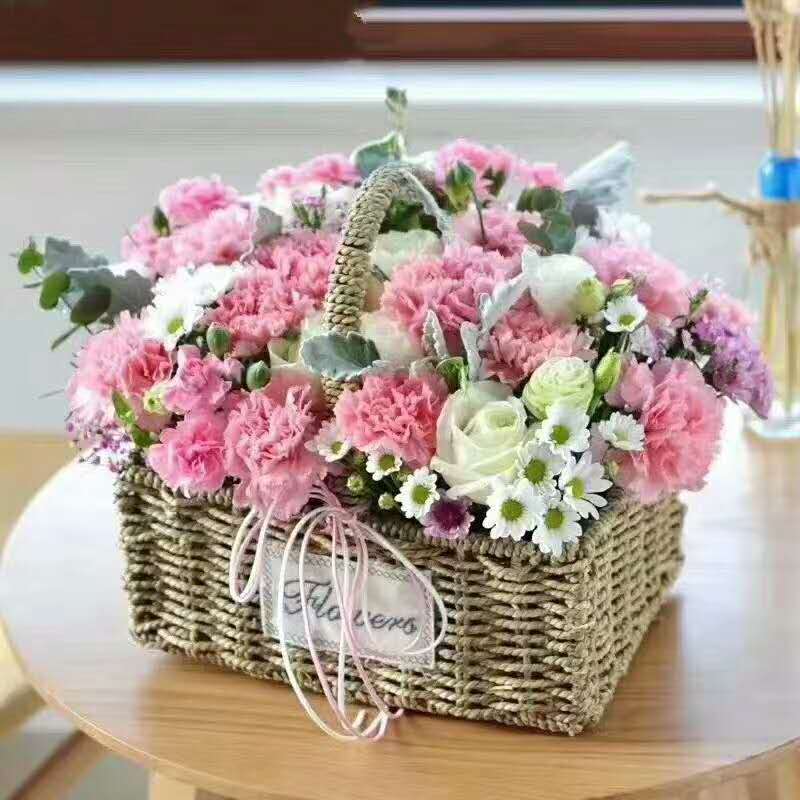 商品簡介:19朵粉康,9朵白玫瑰,小雛菊若干,滿天星間插,綠葉間插,其它配草若干,復古竹籃。