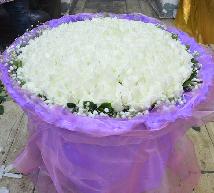 材料包裝: 365朵白玫瑰,紫色網紗包裝